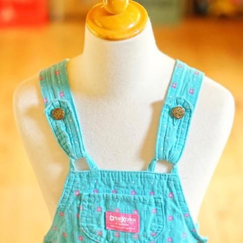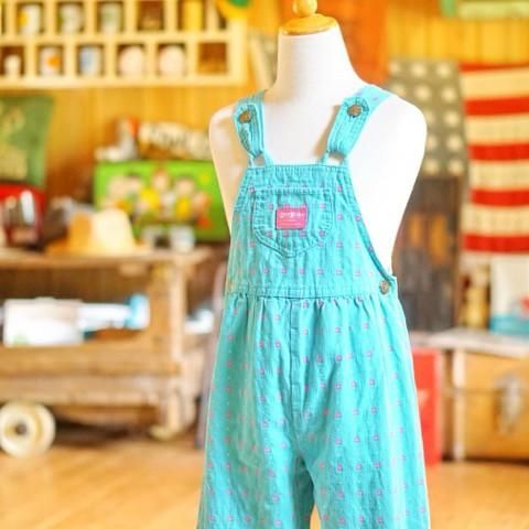 1895年にアメリカ、ウィスコンシン州のオシュコシュにて創業、 アメリカワークブランドの老舗、オシュコシュのキッズオーバーオールUSA製。人気のピンクタグ、ターコイズブルーのような色合いに花柄の可愛い総柄デザインです。