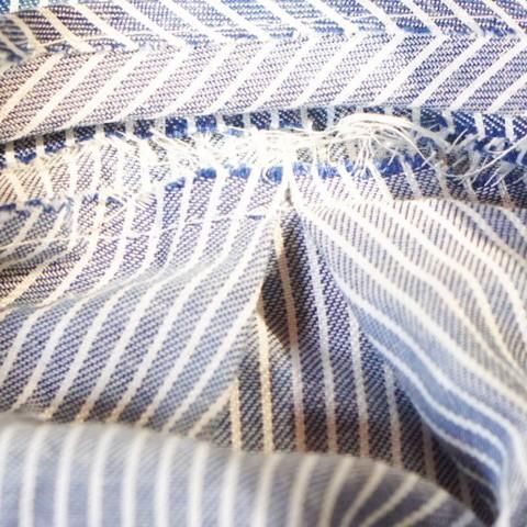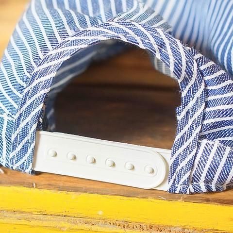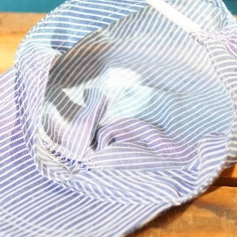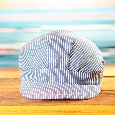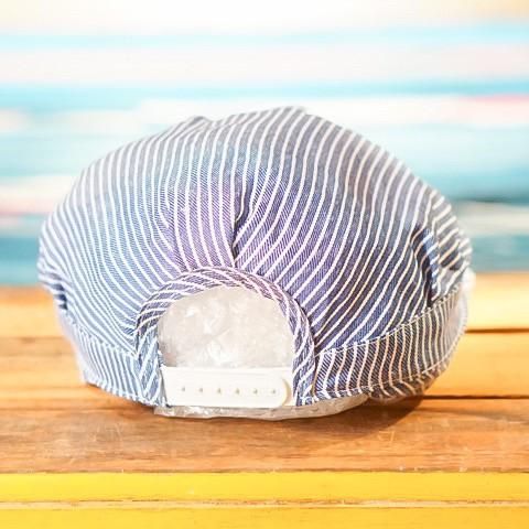 ヒッコリーストライプ柄の雰囲気あるキッズキャップ。後ろにアジャスターが付いていますので、サイズ調節も可能です。