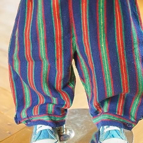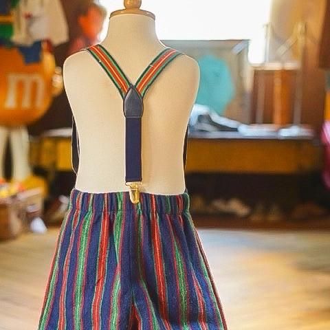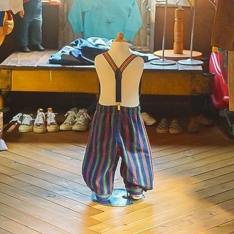 太めのシルエットのストライプ柄パンツは嬉しいサスペンダー付き。