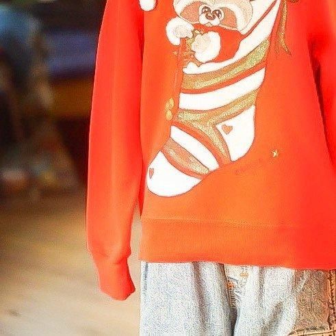 赤×白のキャンディストライプ柄ストッキングに、リボンや星があしらわれたホリデー感たっぷりの一枚です。