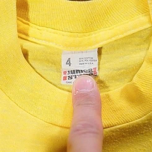 鮮やかなイエローボディに、程よくフェードしたプリントが絶妙なコントラストを生み出し、ヴィンテージならではの風合いとこなれ感を演出。映画公開当時の空気をそのまま纏ったような、スペシャルな一枚です。