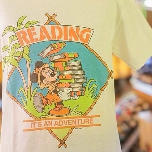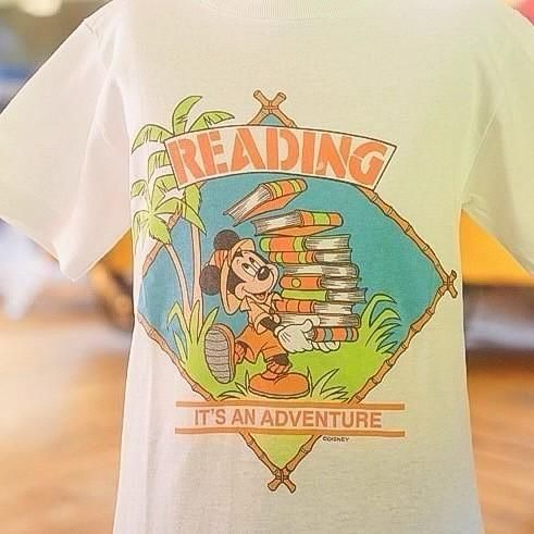 探検家スタイルのミッキーが本の山を抱え、「READING IT’S AN ADVENTURE(読書は冒険だ)」と語りかけるデザインが特徴です。
