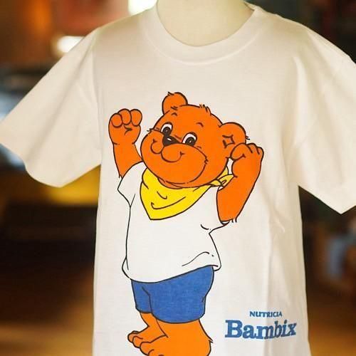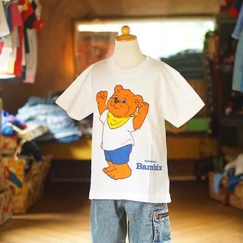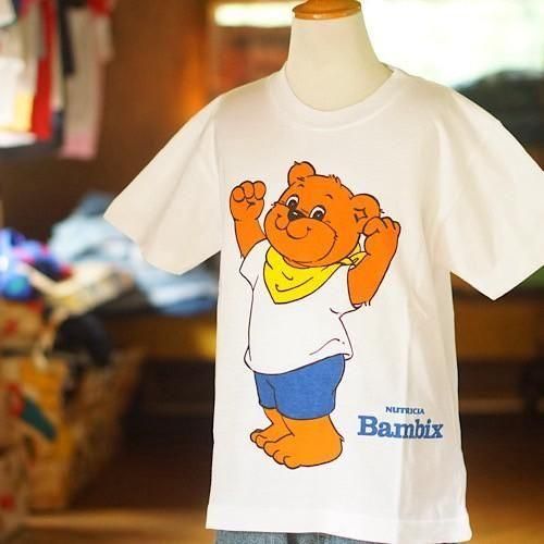 オランダ発のベビーフードブランド「NUTRICIA Bambix(ニュートリシア・バンビックス)」による、プロモーション用と思われるキッズTシャツ。ブランドキャラクターと思われる茶色いクマが、白Tシャツにデニムパンツ、黄色いバンダナを合わせ、元気いっぱいにガッツポーズを決める愛らしいデザインが魅力です。