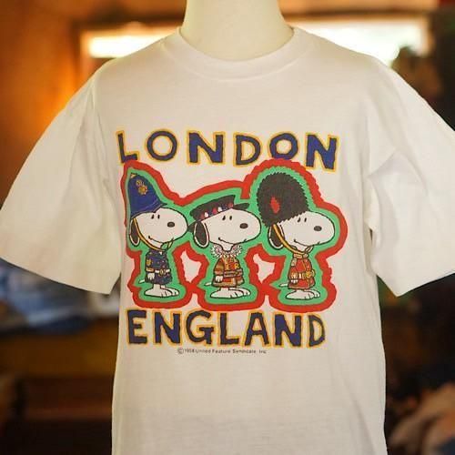 3つのイギリス伝統衣装をまとったスヌーピーが並ぶ、キュートすぎるスーベニアキッズTシャツです。
