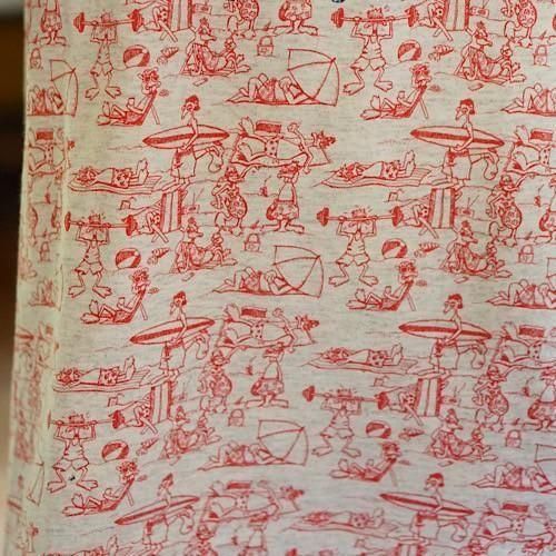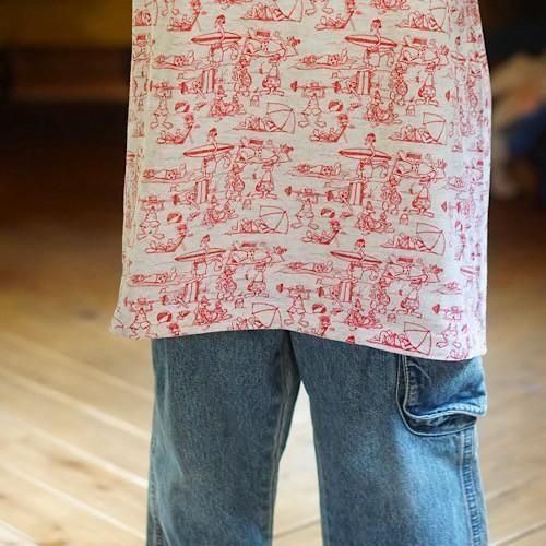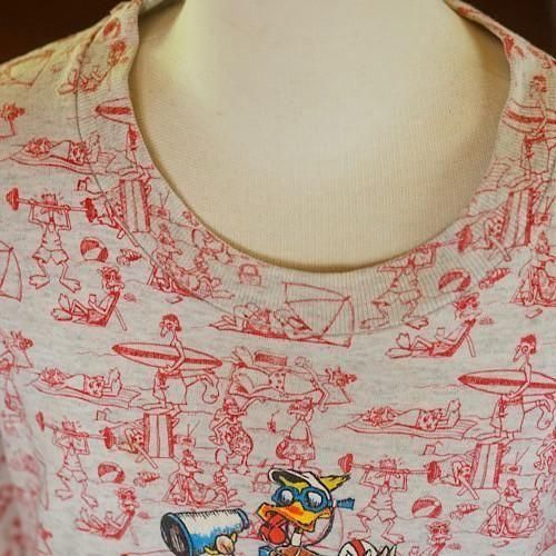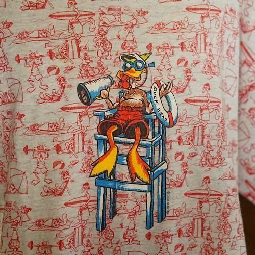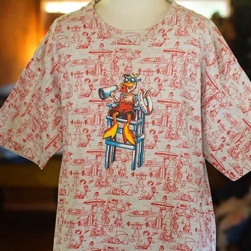 夏のビーチを舞台に、ライフガード姿のキャラクターが描かれた一枚。ボディ全体にはビーチパラソル、浮き輪、バーベルなど夏のレジャーシーンが緻密に描かれ、アメリカンコミックのような世界観に包まれています。タグにはアヒルのロゴが象徴的な「DUCK HEAD」のネーム入りで、ブランドファンにも刺さるポイント◎