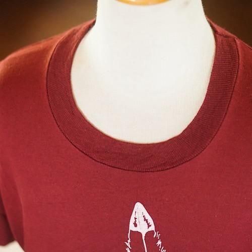 バーガンディカラーのボディに白インクのプリントが映え、全体としてクラフト感のある印象です。