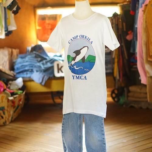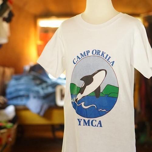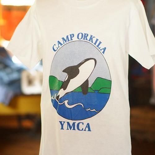 アメリカ・ワシントン州の自然豊かなオーカス島で実際に運営されている、**YMCA主催のアウトドアキャンプ「Camp Orkila」**の記念キッズTシャツ。