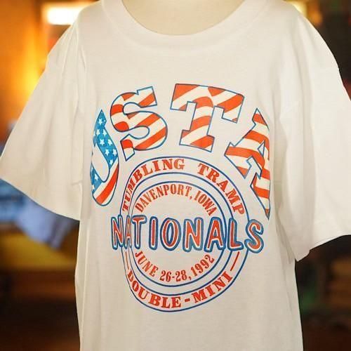 トランポリン・タンブリング・ダブルミニの3競技を対象とした全米選手権の記念Teeで、星条旗をあしらった“USTA”ロゴと、開催地・日付が力強くデザインされた一枚。