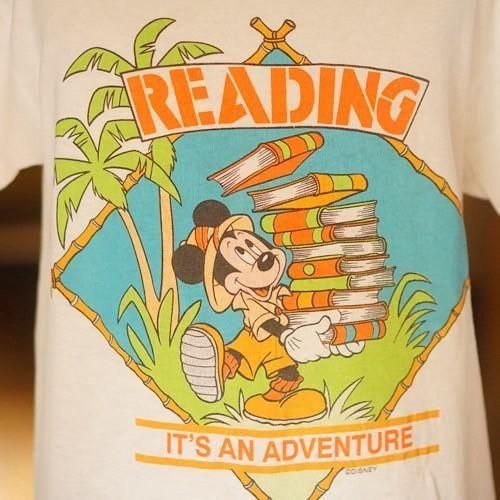 探検家スタイルのミッキーが本の山を抱え、「READING IT’S AN ADVENTURE(読書は冒険だ)」と語りかけるデザインが特徴です。