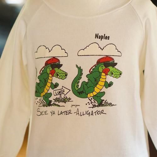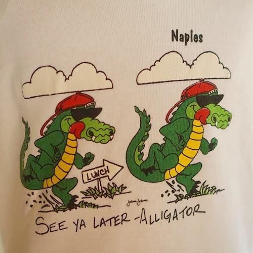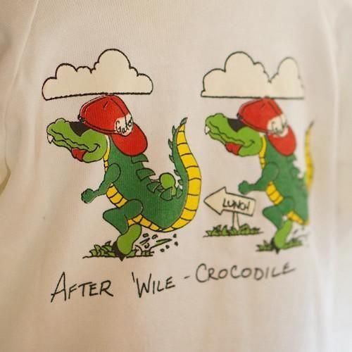 フロントには「See ya later – Alligator(じゃあね、アリゲーター)」、バックには「After wile – Crocodile(また後で、クロコダイル)」と、英語の言葉遊びを用いたフレーズが描かれています。