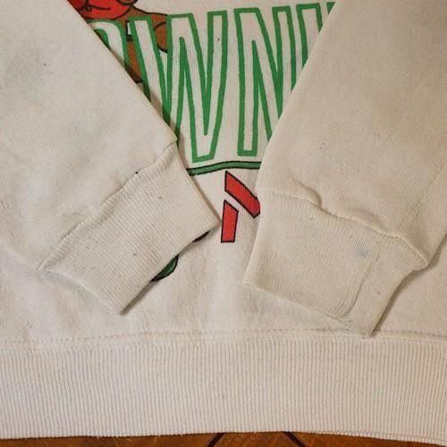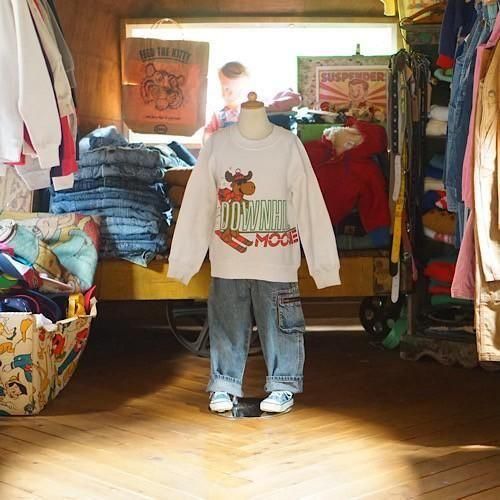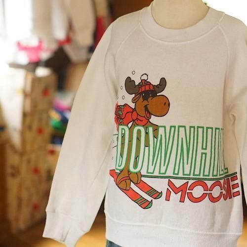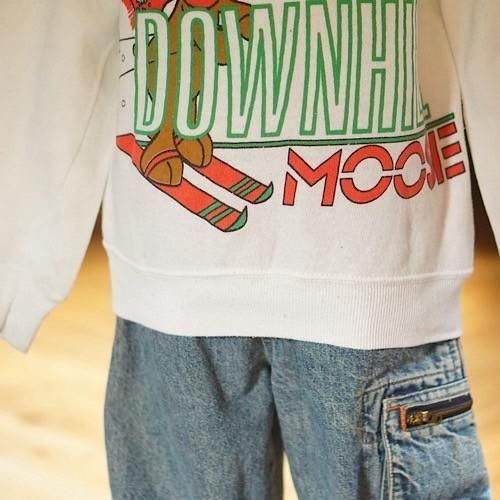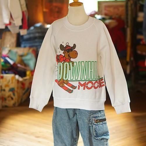 雪山を滑走するムースをユーモラスに描いた一枚。ホワイトボディにグリーン&レッドの鮮やかな配色が映え、冬らしいシーズナル感を演出しています。ラグランスリーブ仕様で、動きやすくカジュアルなシルエットが魅力的なキッズスウェットです。