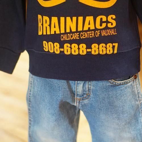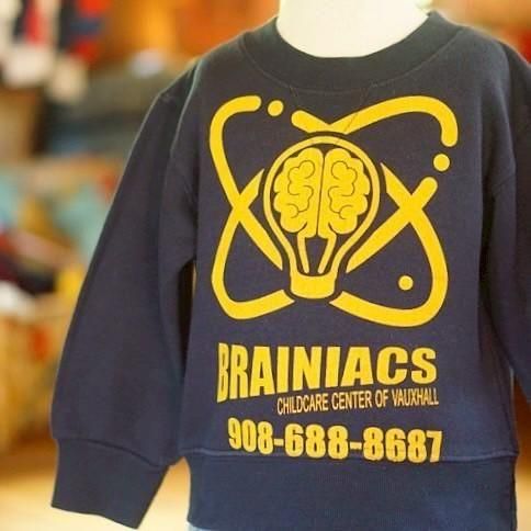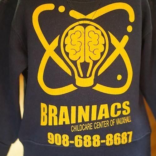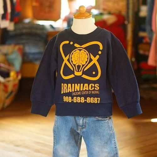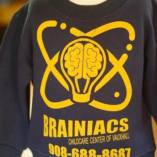 プリント下部には「BRAINiACS CHILDCARE CENTER OF VAUXHALL」の表記と電話番号が入り、アメリカ・ニュージャージー州ヴォークスホールにある保育園のために製作されたローカルアイテムであることがわかります。園名の「BRAINiACS(ブレーニアックス)」は「賢い人たち」という意味の愛称で、知的好奇心を育む園の理念がデザインにも反映されています。