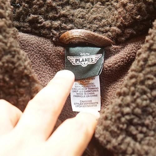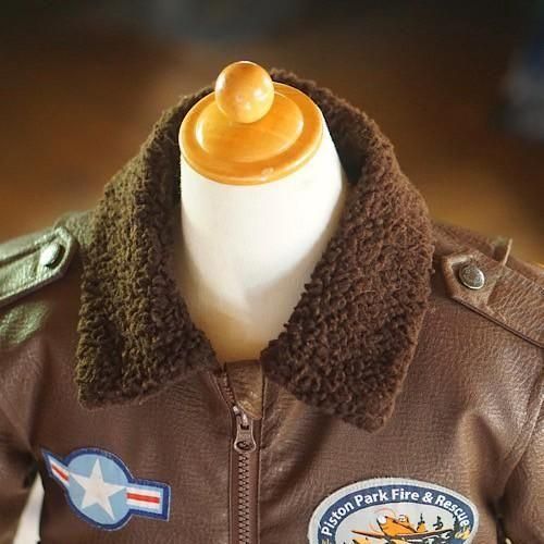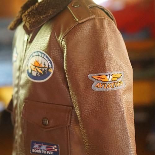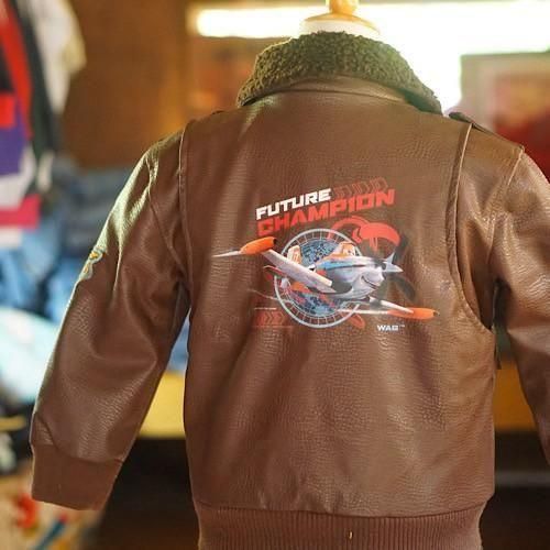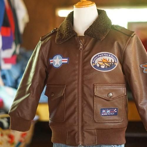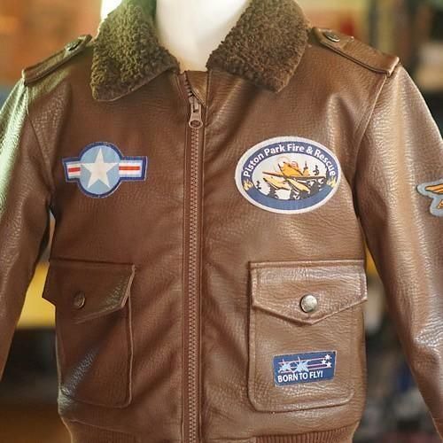 ディズニー映画『Planes(プレーンズ)』をモチーフにした、キッズ用フライトジャケットスタイルのブルゾン。濃いブラウンのフェイクレザーをベースに、胸や袖に施されたミリタリーパッチが本格的なパイロット感を演出します。