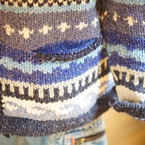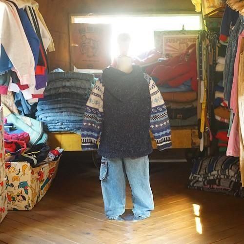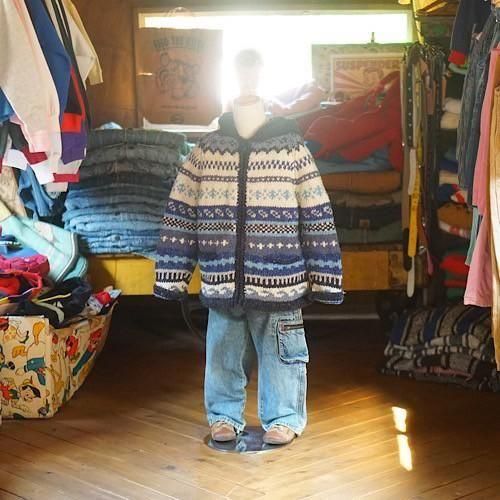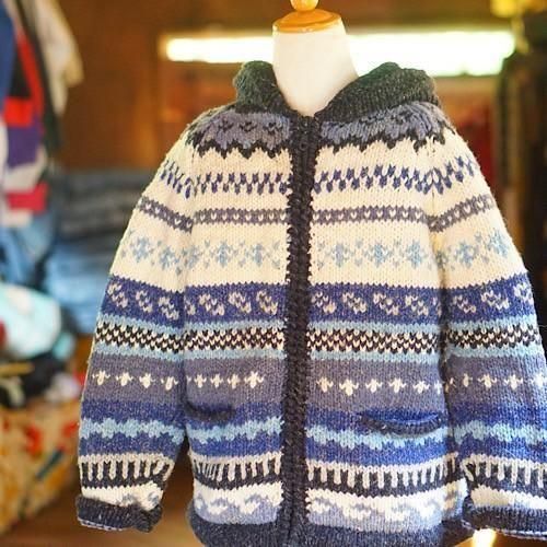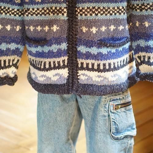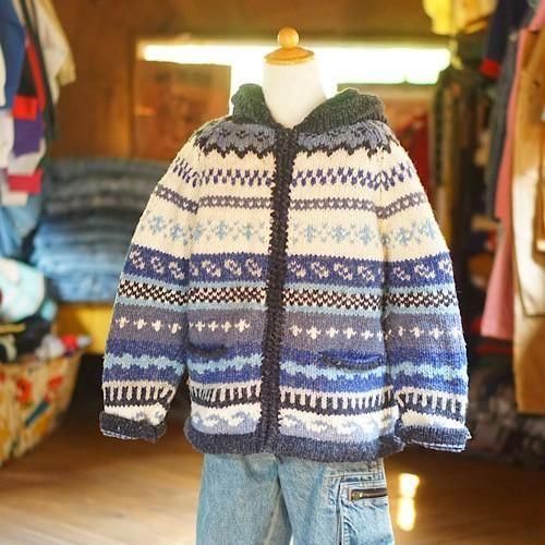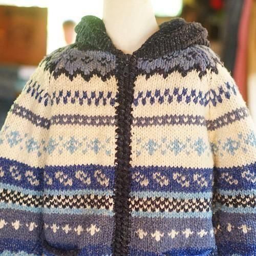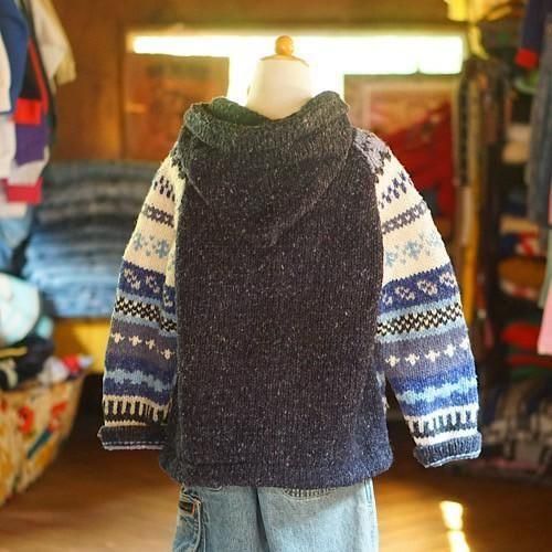 フロントは着脱が容易なジッパー仕様で、両サイドにはハンドウォーマーポケットを配置。背面とフード部分は無地のネイビーで切り替えられ、柄とのコントラストが引き立ちます。厚みのあるウール生地は高い保温性を誇り、寒冷地や冬のお出かけにも最適です。