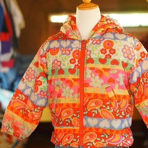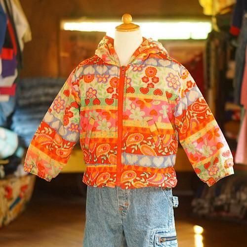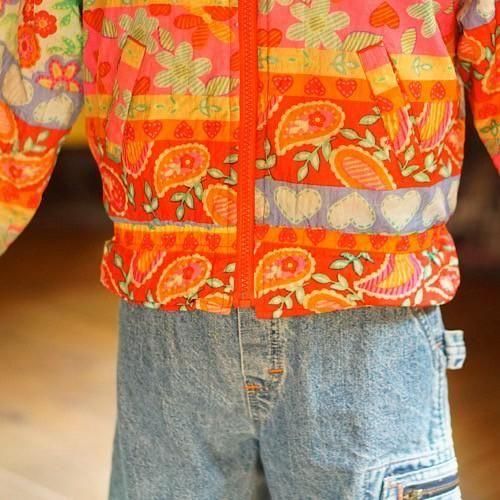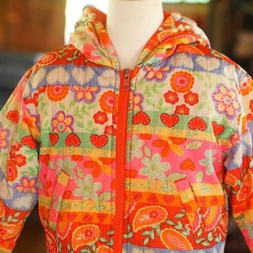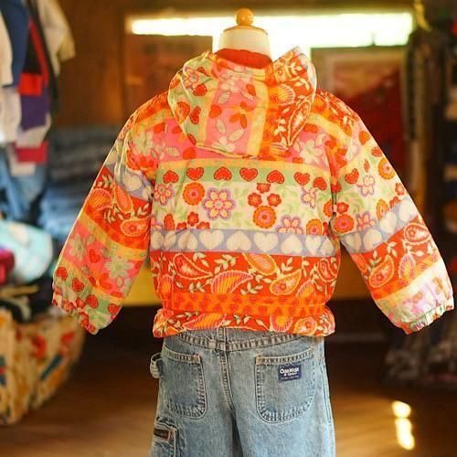 オレンジを基調に、花やハートなどのモチーフを色鮮やかなボーダー柄であしらったキッズ用中綿ジャケット。カラフルでポップなデザインが視線を集め、冬のスタイルに明るさと遊び心を添える一着です。
