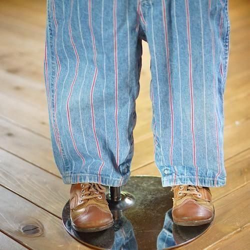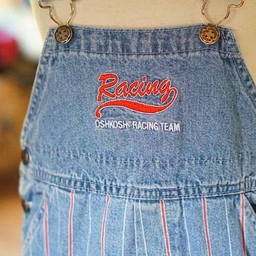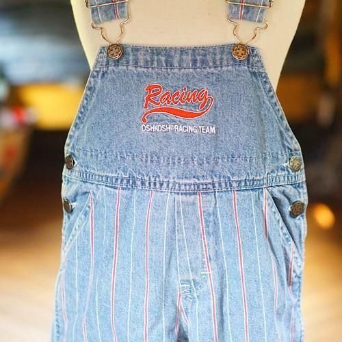 “Racing OSHKOSH RACING TEAM” のロゴ刺繍が映え、ライトブルーのデニムにレッドとホワイトのピンストライプが走る爽やかなデザインで、スポーティーな雰囲気とワークウェアのタフさを兼ね備えています。