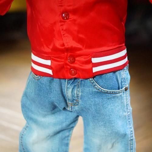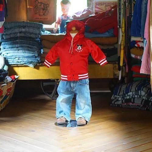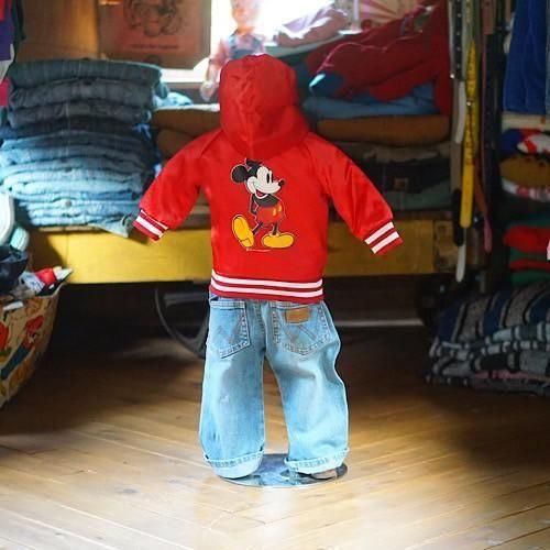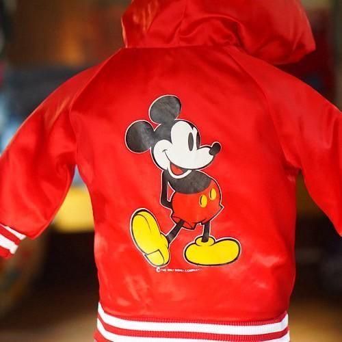 ビビッドなレッドボディに、クラシックミッキーをフロント&バックに配したデザインのキッズナイロンジャケット。胸元にはワンポイントロゴ、背面には堂々と立った姿のビッグミッキープリントが入り、後ろ姿までしっかり存在感を放ちます。