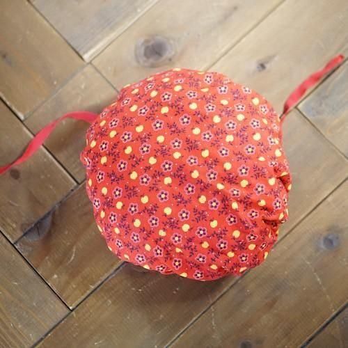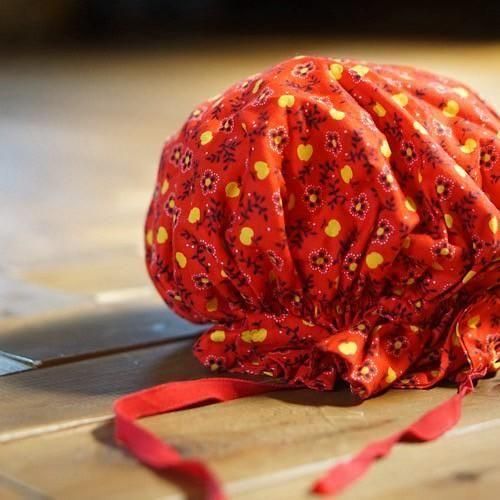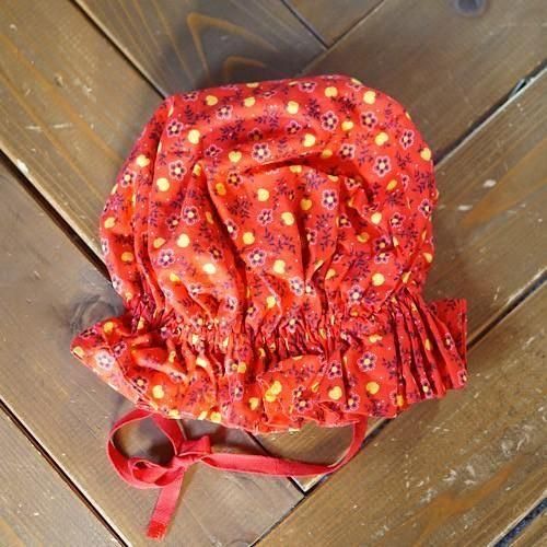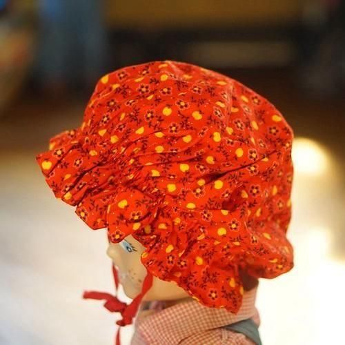 鮮やかなレッド地に小さなりんごと小花柄をあしらったキッズ用ボンネット帽。