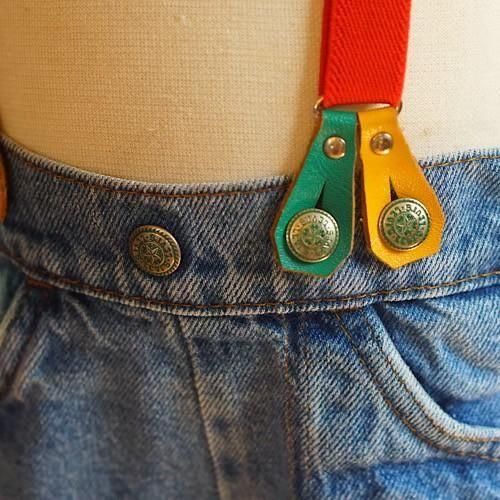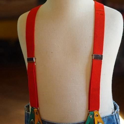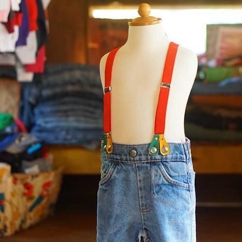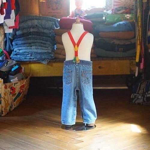 アメリカ製Little Levi’s(リトルリーバイス)のヴィンテージキッズデニムパンツ。ライトブルーに色落ちした柔らかなデニムに、鮮やかな赤のサスペンダーとグリーン×イエローのレザーパーツを組み合わせたポップなデザインが印象的です。股下にはスナップボタンが並び、着脱やオムツ替えが簡単に行えるベビー〜トドラー仕様。バックポケットにはオレンジタブ。ヴィンテージならではの風合いとカラーアクセントが際立つ、コレクタブルな一本です。
