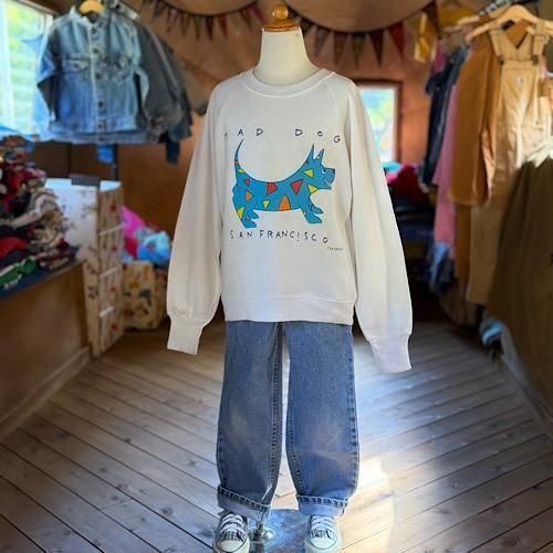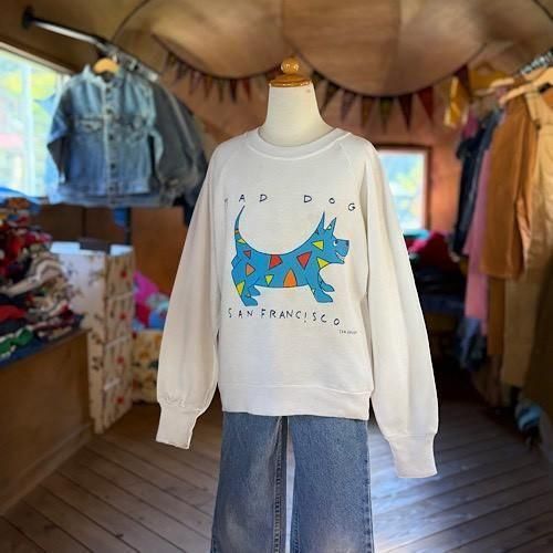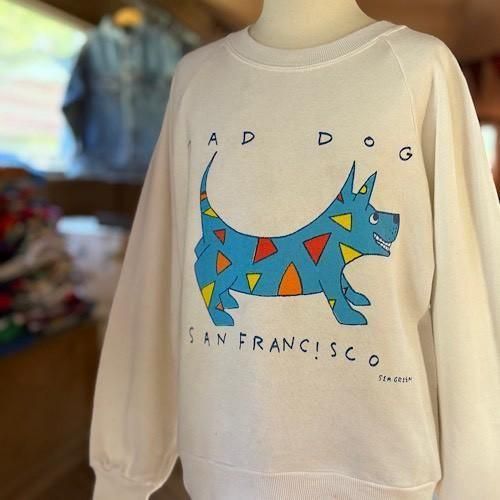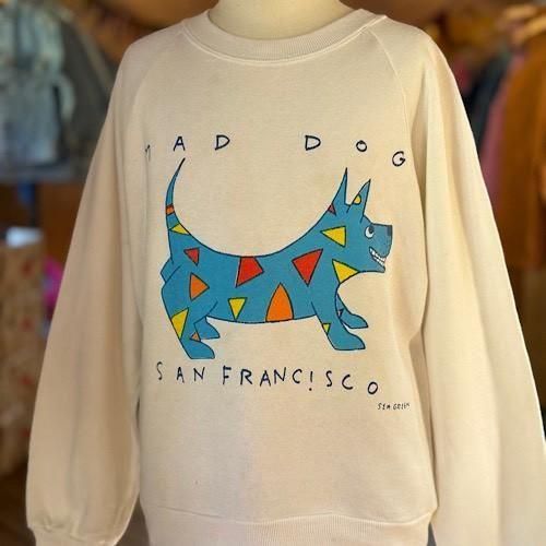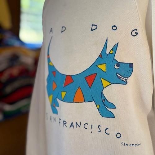 フロントには「MAD DOG SAN FRANCISCO」のアートワーク。鮮やかなブルーの犬のシルエットに、レッドやイエローのカラフルなアクセントを散りばめたデザインが特徴です。遊び心とアート感覚が融合したプリントは、当時のサンフランシスコカルチャーを感じさせる一枚。