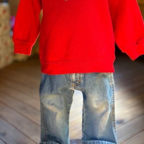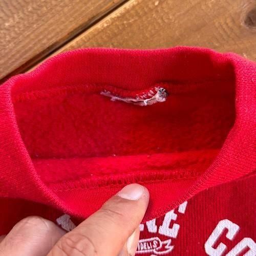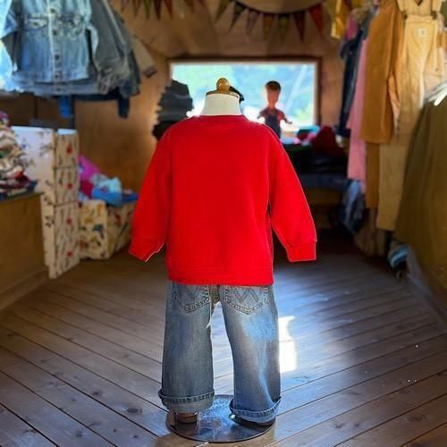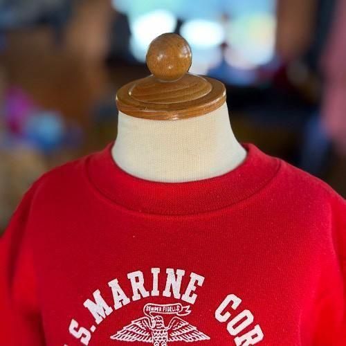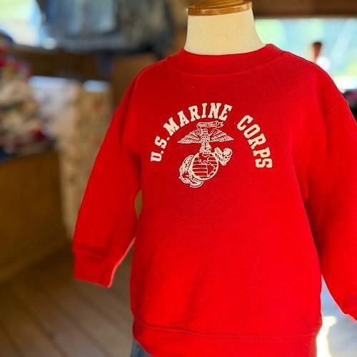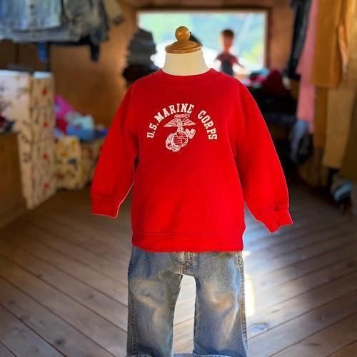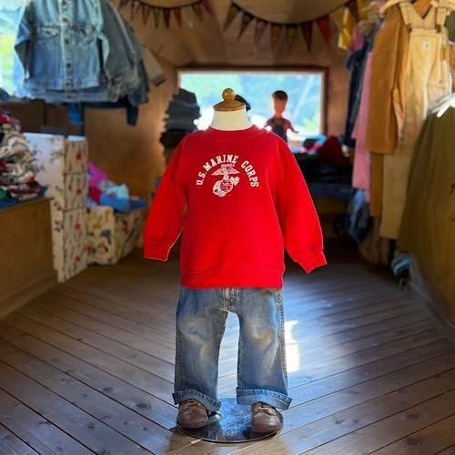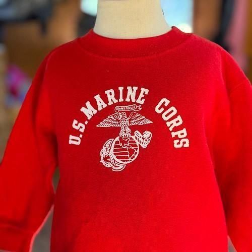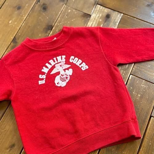 深みのあるレッドボディに、U.S. MARINE CORPS のアーチロゴと象徴的なエンブレムをプリントしたヴィンテージキッズスウェット。