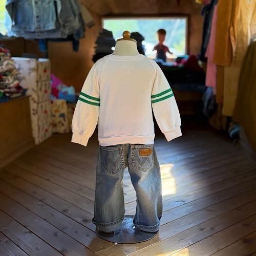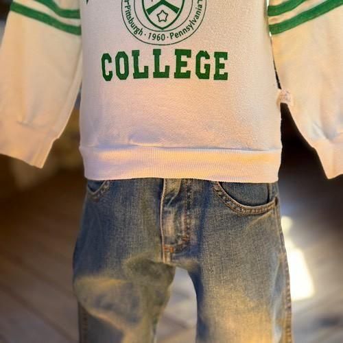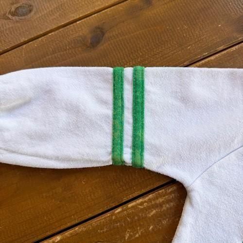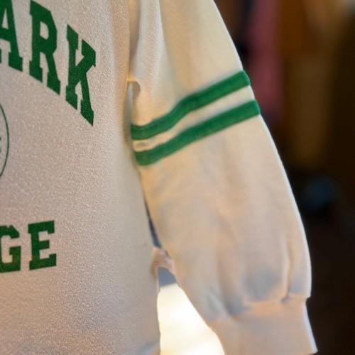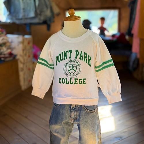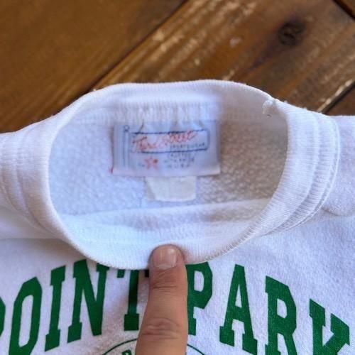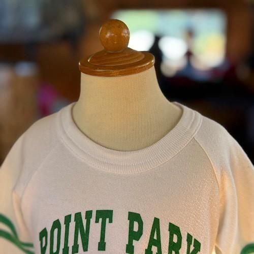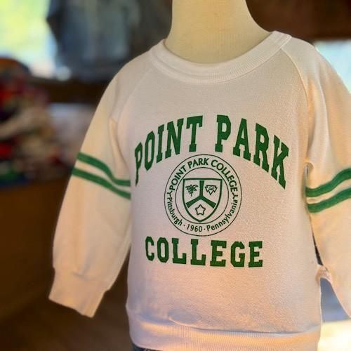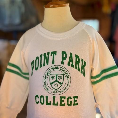 ホワイトボディに鮮やかなグリーンで「POINT PARK COLLEGE」のカレッジロゴをプリントしたヴィンテージスウェット。胸中央のカレッジエンブレムに加え、両袖にはグリーンの2本ラインが入り、スポーツテイストを強調したデザインが魅力です。