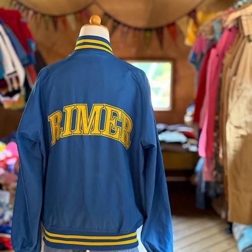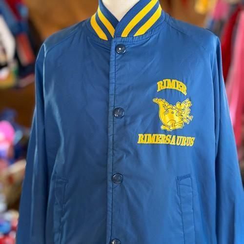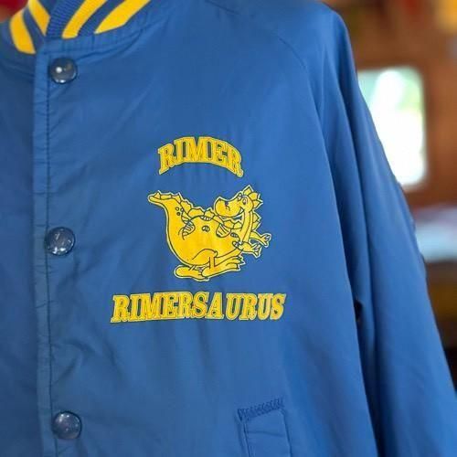 クラシックなブルー×イエローのスクールカラーに、胸と背面へ大胆にプリントされた「RIMER」「RIMERSAURUS」のマスコットグラフィックが印象的な一着です。