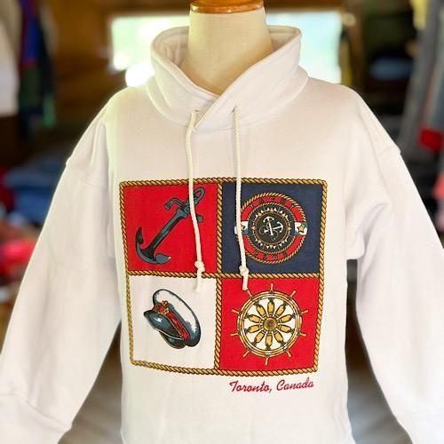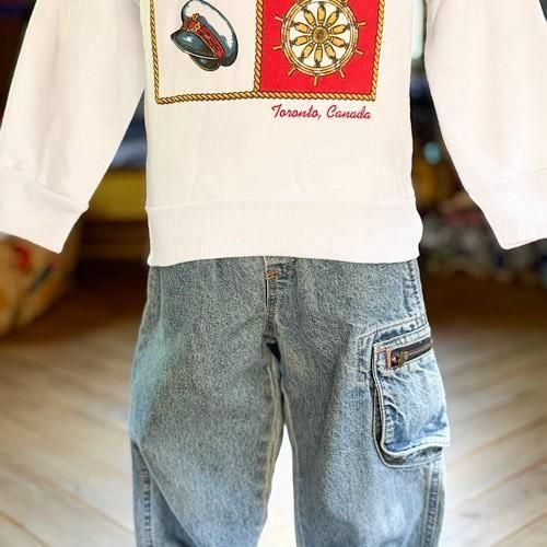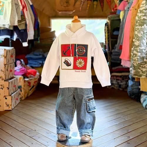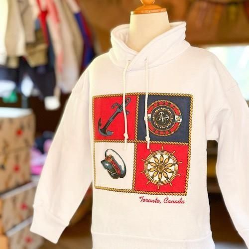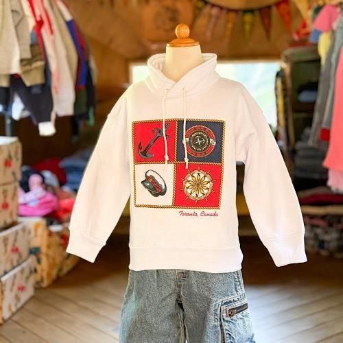 トリコロールカラーのブロッキングと、アンカー・羅針盤・操舵輪・キャプテンキャップといったマリンモチーフを組み合わせた、クラシカルな雰囲気のヴィンテージキッズスウェット。