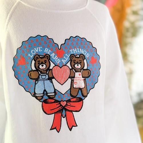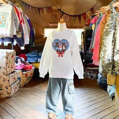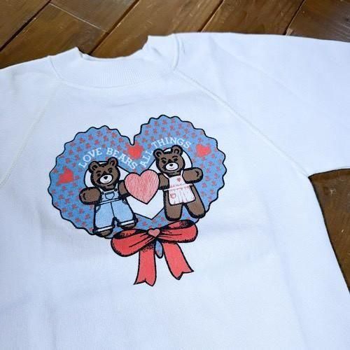 ホワイトボディに、大きなハートとリボンをモチーフにしたペアベアデザインが配されたヴィンテージキッズスウェット。