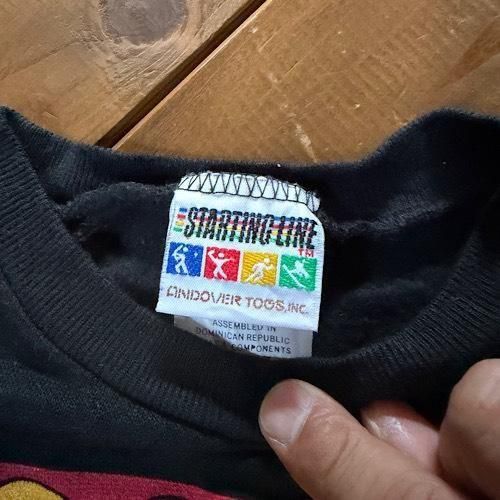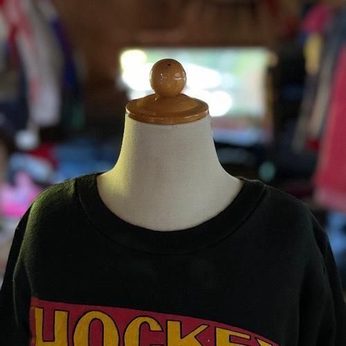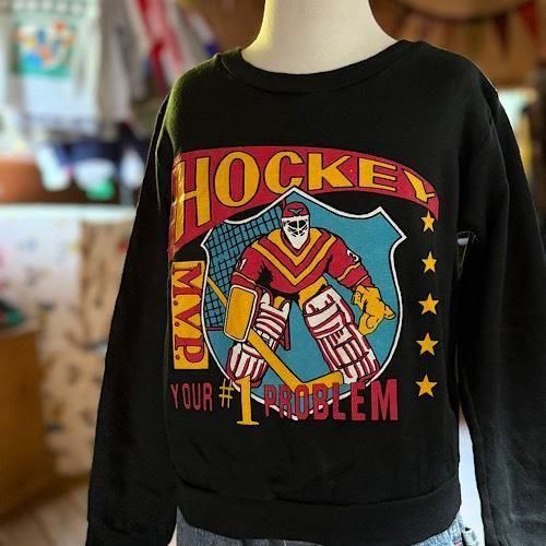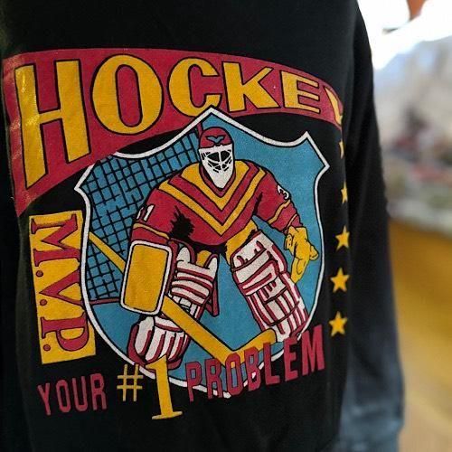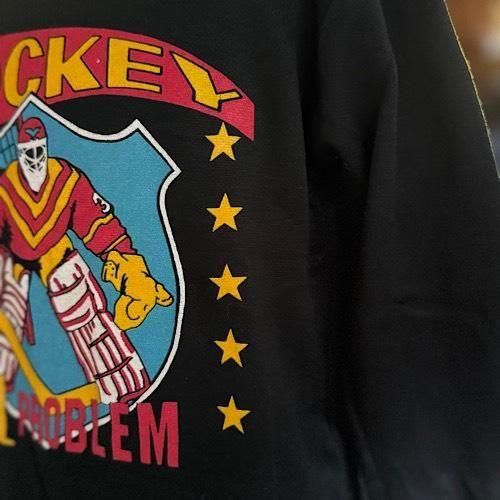 特にゴーリーのユニフォームやフェイスマスクの描写が細かく、スポーツチームのロゴ風に仕上げられた構図は“プリントを楽しむ”ヴィンテージならではの存在感。