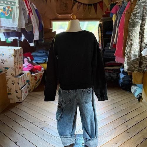 ブラックボディをベースに、バーガンディ・イエロー・ターコイズブルーの3色構成で描かれた大胆なデザインは、当時のアメリカンキッズウェアらしいエネルギッシュな配色バランスが魅力です。