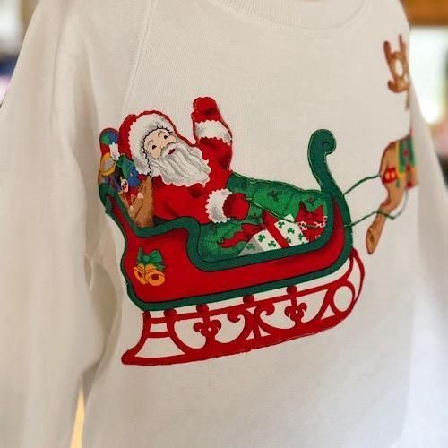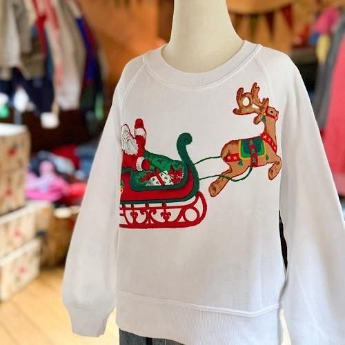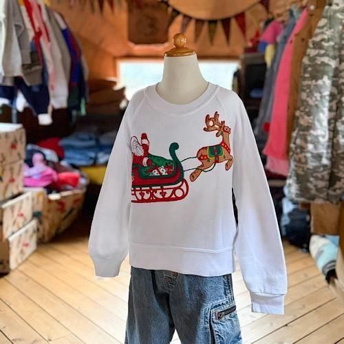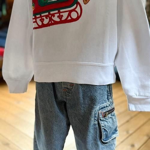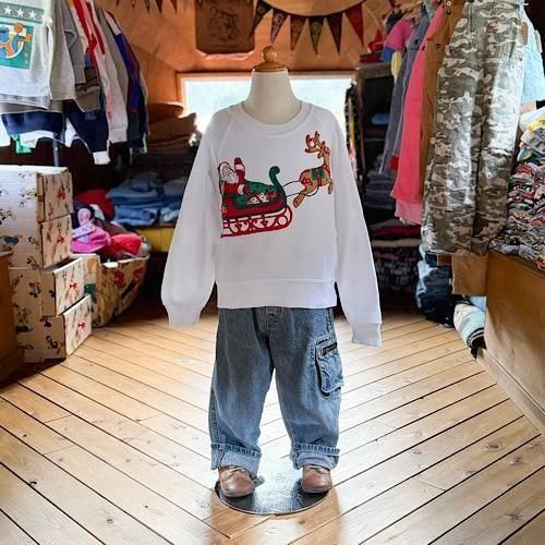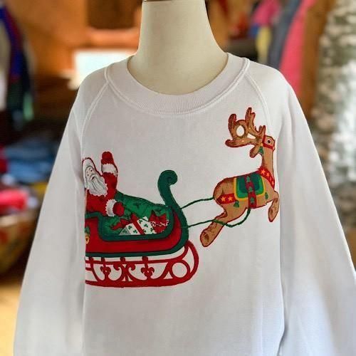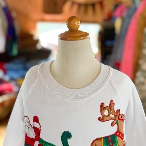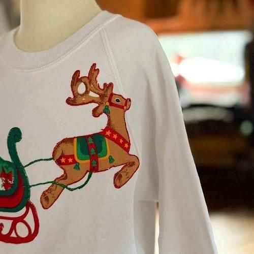 真っ白なホワイトボディに、サンタクロースが乗るソリとルドルフが大胆にレイアウトされたクリスマススウェット。プリントではなく、色柄生地を切り抜いて縫い付けたアップリケ仕様になっており、縁や赤が囲むようにステッチが入る凝ったつくりがポイント。フラットなプリントとは異なる、立体感のある表情がヴィンテージらしい存在感を放ちます。