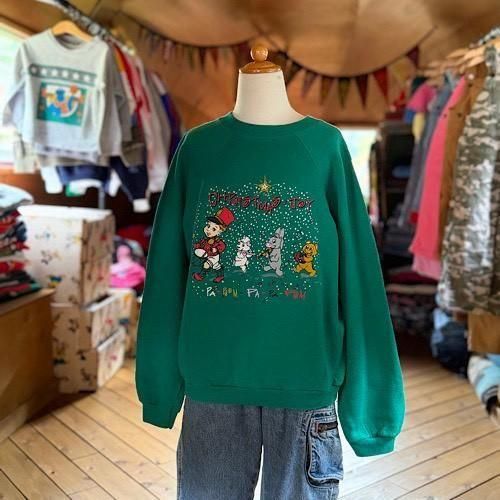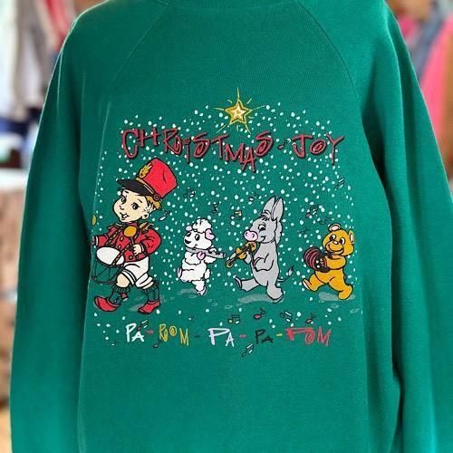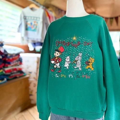 ホリデーらしい楽しげな空気をしっかりまといながら、色使いと間のとり方にセンスを感じるヴィンテージプリントスウェットです。